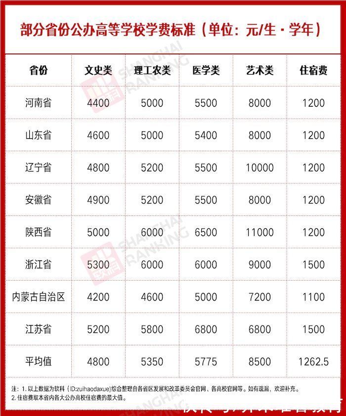 从中可见,除费用较高的艺术类学费外,现阶段高校全日制学生的平均学费大致在5300元左右,住宿费约为1262元。