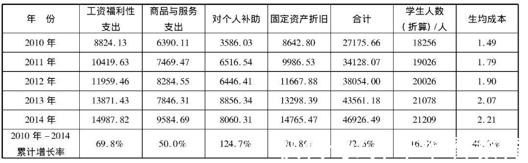 以北京某高校为例,根据论文《高校生均成本分析——基于某高校数据》的分析,北京某高校2010-2014年教育生产者的成本及生均成本如下表所示。