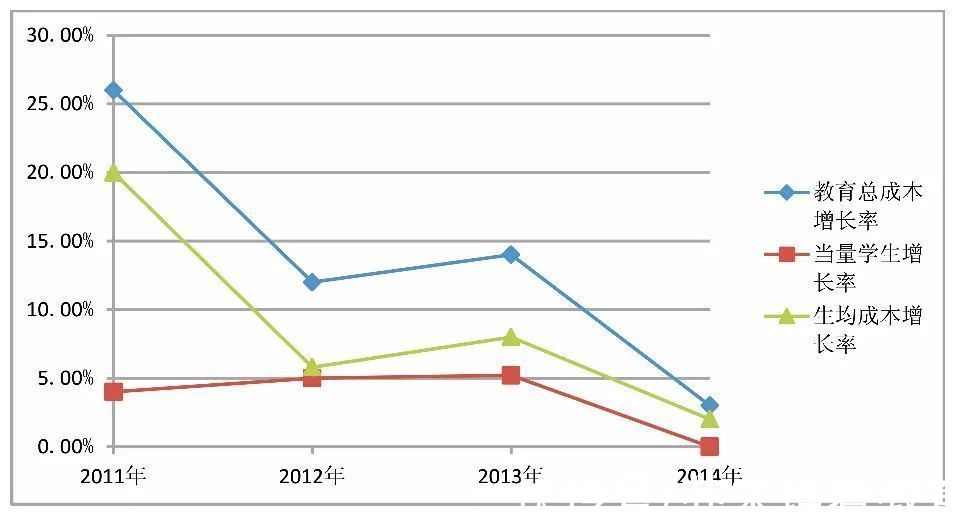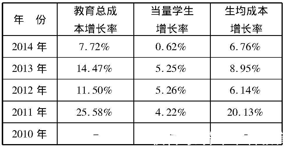 从表中可见,生均成本在2010-2014年间是不断上涨的,而且从表2和图1来看,教育总成本、当量学生、生均成本三者的增长率在2012-2014年变化是比较一致的。