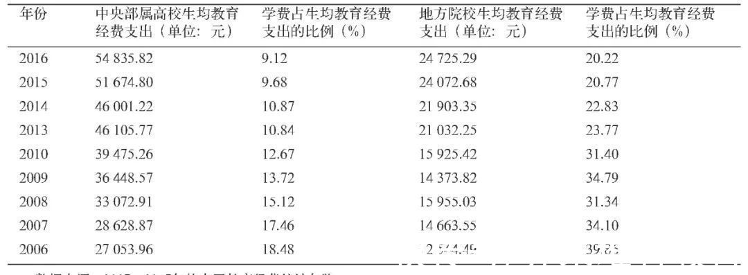 中央部属校和地方院校的生均教育经费支出 图源:论文《社会正义视野下我国重点高校学费制度之审视与设计》